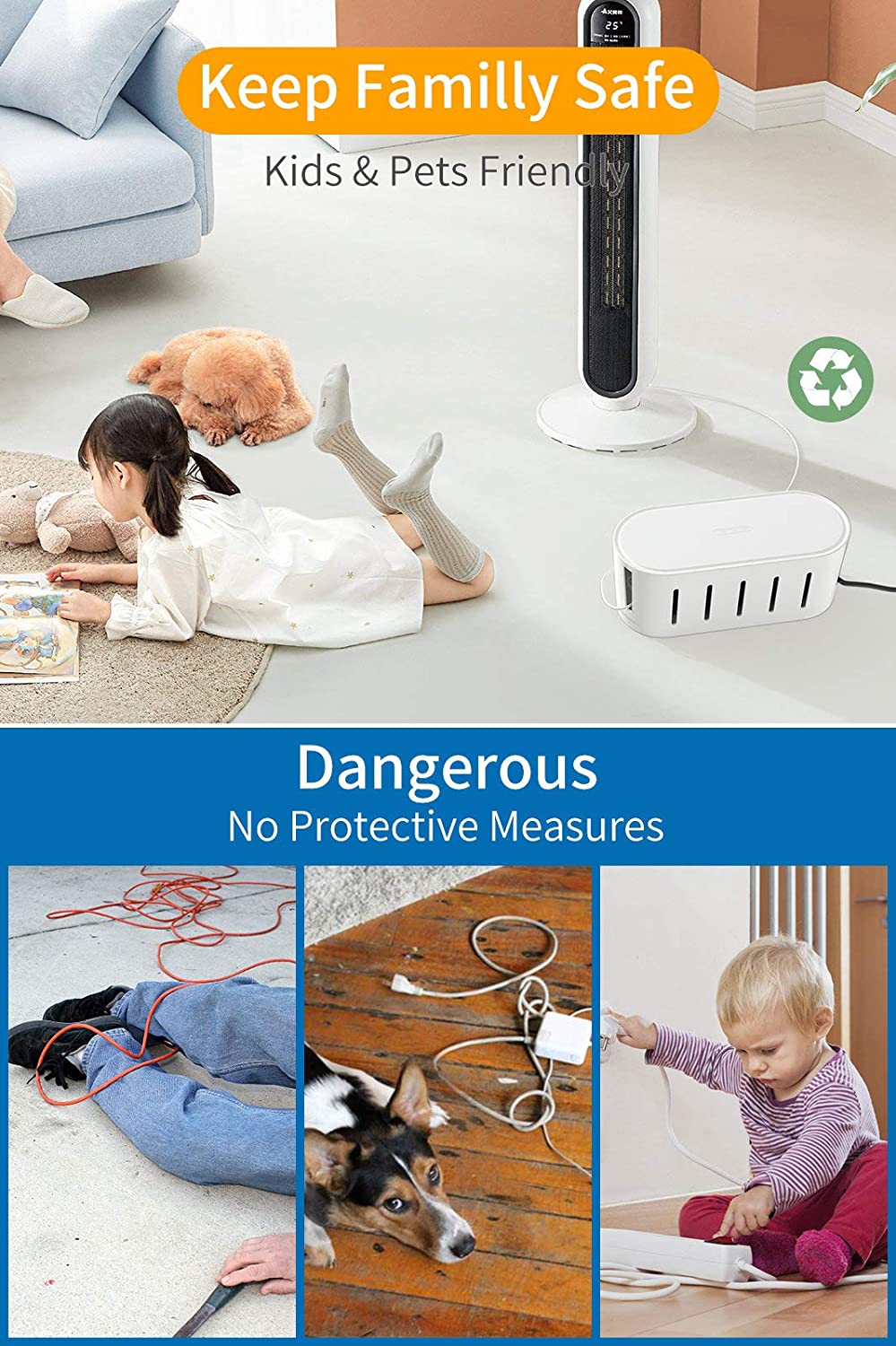 This cable box combined with a cover will protect your naughty kids and pets from touching or chewing the power cables as well as other electrical equipment.