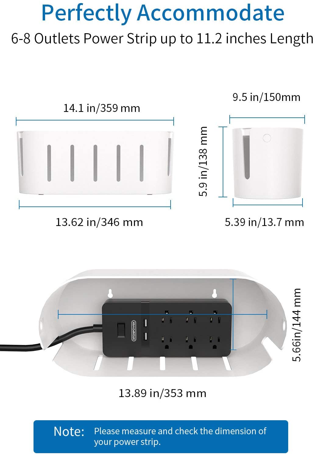 TIPS: The inside dimensions of this box is 13.9 X 5.66X 5.23 inches, please measure and check the dimension of your power strip, surge protector or power adapter before purchase, and make sure your power strip is suitable to place inside this box.