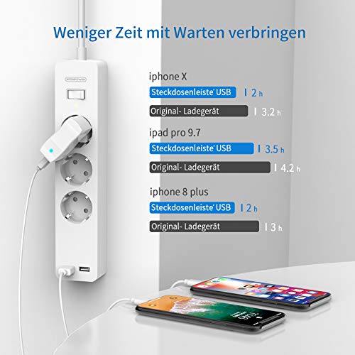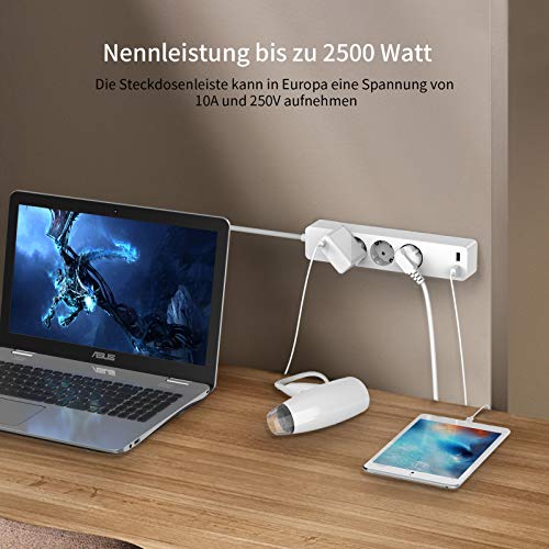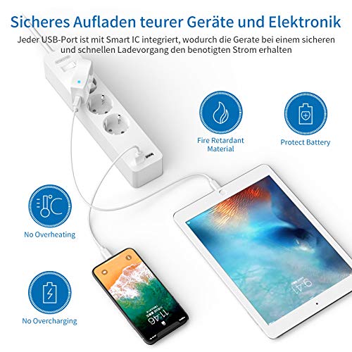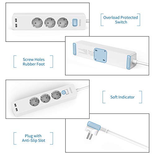 [POWER STRIP WITH USB]: This power strip has 3 regular power outlets and 2 additional USB ports (max. 2.4A), which allows charging 5 devices at the same time. Such as smartphones, lamps, fans, camera batteries, tablet computers, etc. Now it's time to say goodbye to the bulky chargers