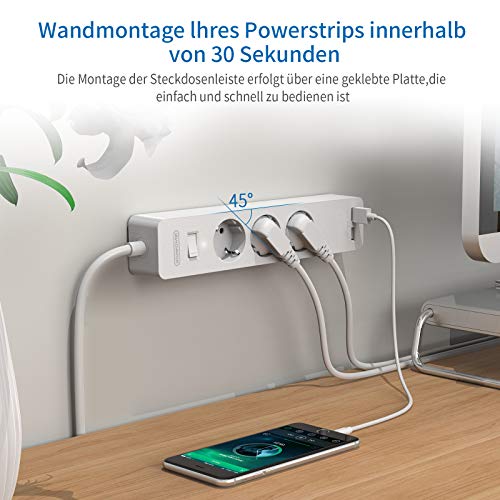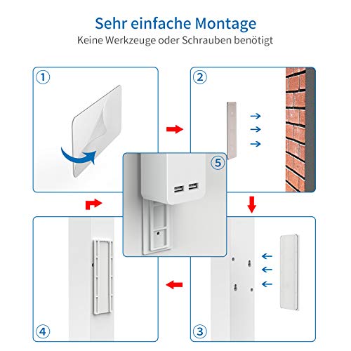 [NO SCREWS NEEDED]: The power strip comes with a mounting plate that consists of two parts. One side sticks to the wall, the other is attached to the multiple socket. All you have to do now is glue the two panels together.