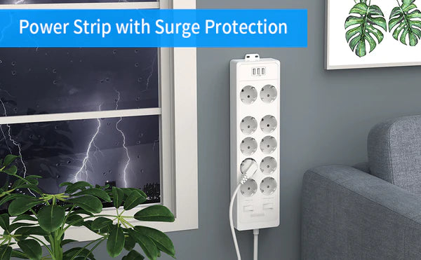 • [4000J surge protected power strip with USB] Thousands of German households lose their expensive electronics every year in thunderstorms.?A 10-way power strip with good surge protection can effectively protect your TV, sound system, PC from surges and save your money.