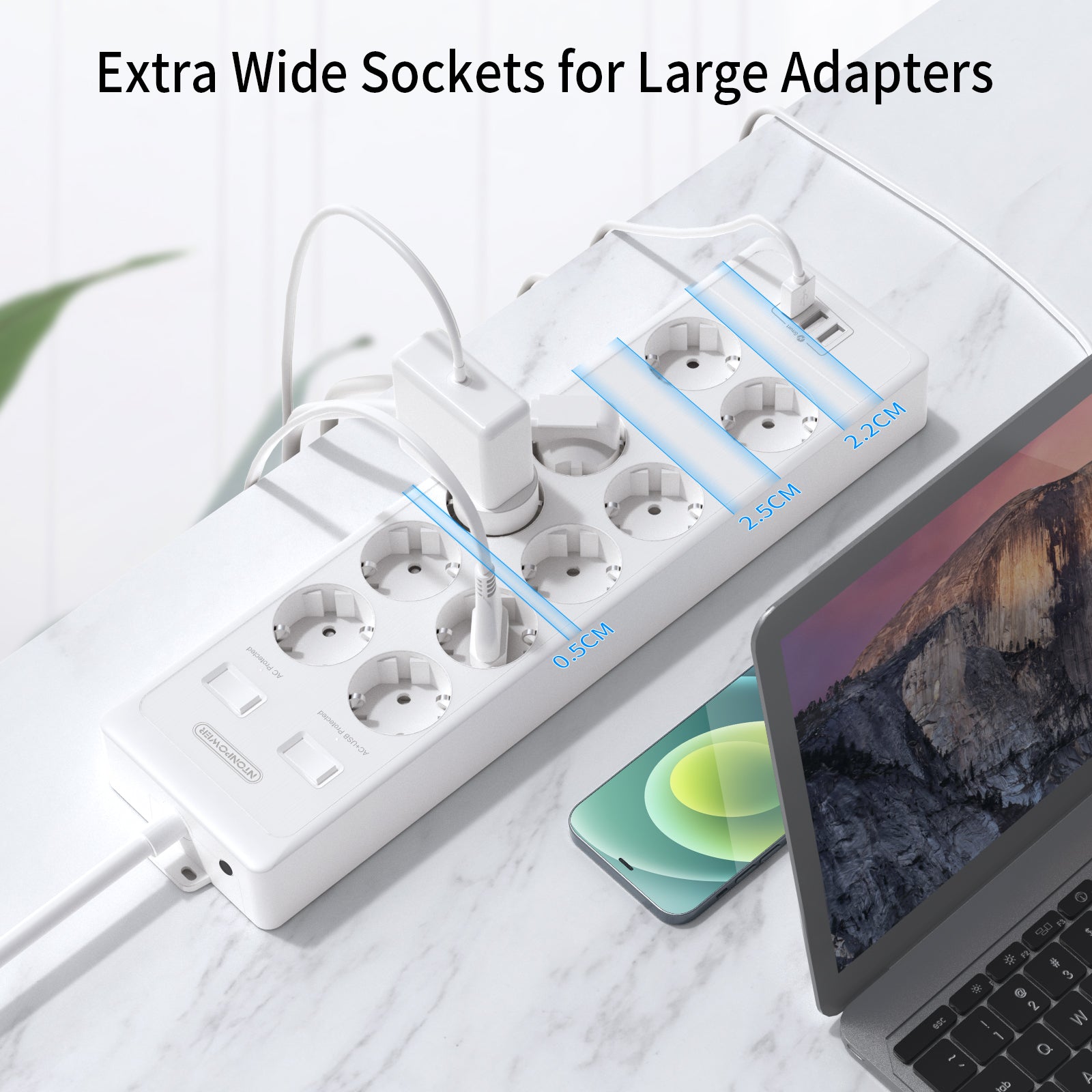 • [Extra Wide Sockets for Large Adapters] You will find some large adapters that take 'two sockets' when you plug them in. This USB power strip offers extra wide sockets, so you can use a large adapter without occupying the adjacent sockets.?A wide socket saves you more sockets.