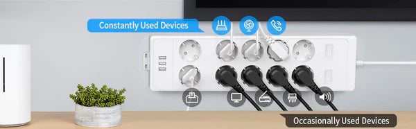 • 10-way power strip with two single switches: you can control 3 m different devices with individual switches on this power strip.?For example, one side of the sockets is for TV, floor lamp, DVD player, which are turned off at night.?And the other side of the sockets for router, phone, NAS, which need to be on all the time.