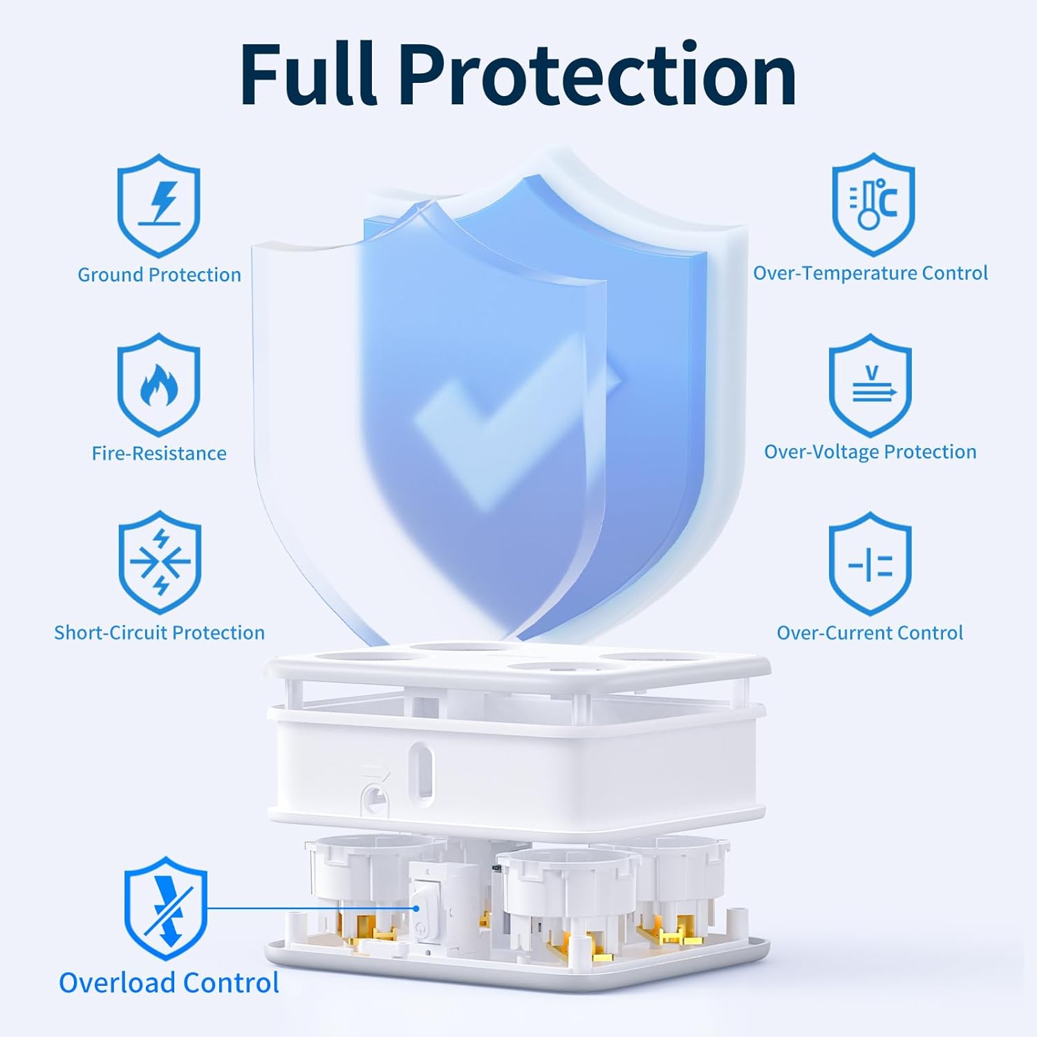 • COMPREHENSIVE PROTECTION Fireproof material with high quality standard ABS and thick power cord, resistant to 750℃ high temperature. The switch has an overload protection function. If the current is too large, it will automatically shut off the power to protect the chargers. Earthing protection and surge protection provide safer protection for household appliances.