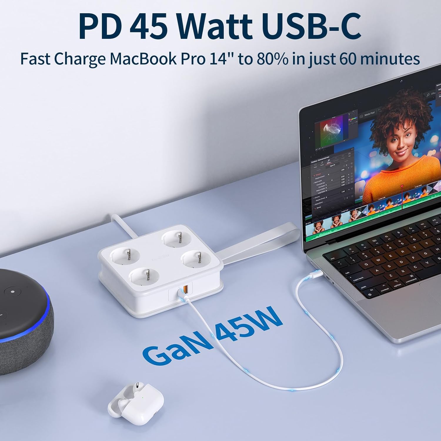 • USB-C fast charging: it uses GaN material and the 45W power delivery USB-C output of the multiple socket is powerful enough to quickly charge a variety of devices such as smartphone, tablets, laptops etc. The USB-C can charge a MacBook Pro 14" to 50% in just 37 minutes.