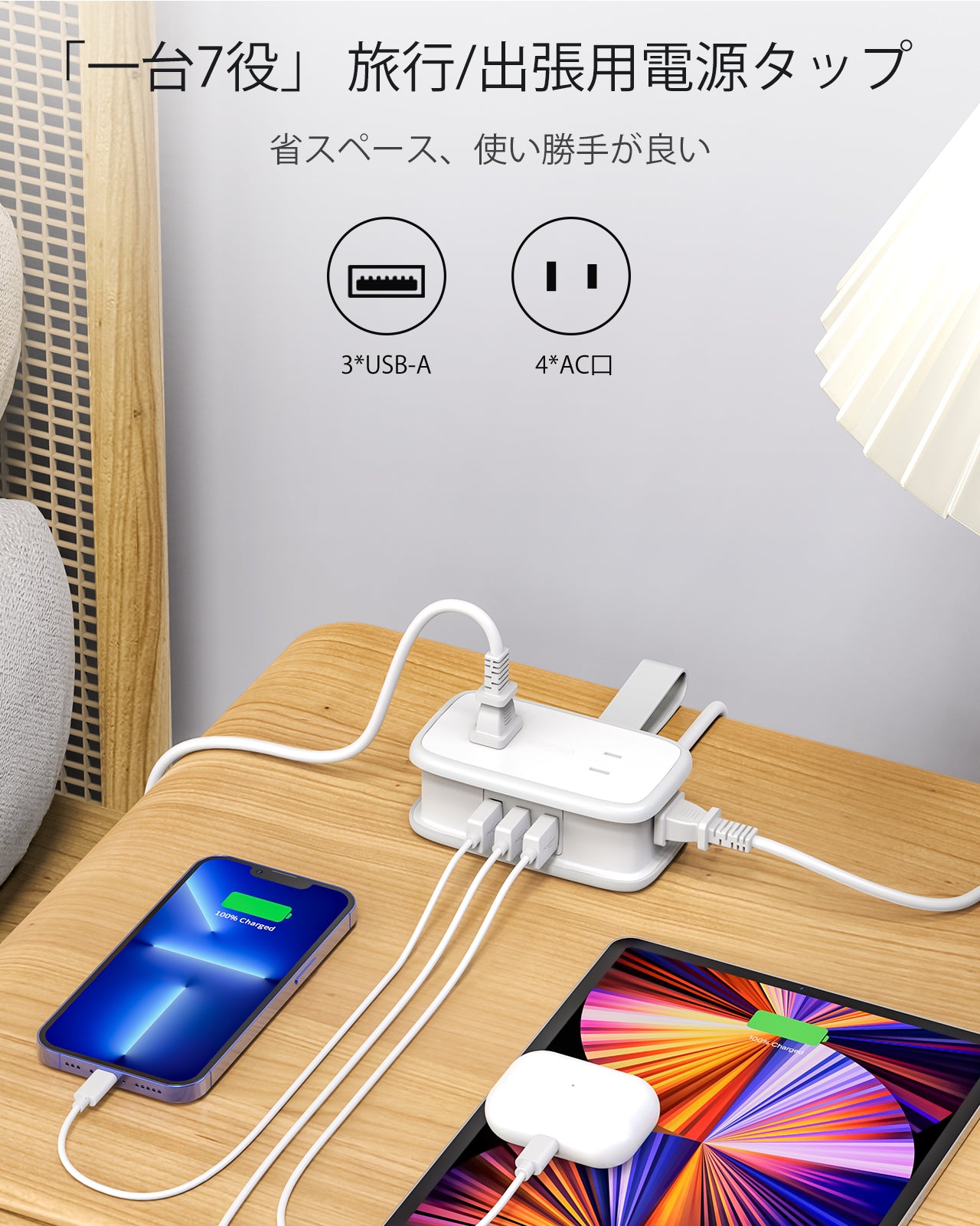 - ?7-in-1 Travel Power Strip: This product is a small, lightweight, compact Pocket power strip. There are 4 AC outlets, plus 3 usb-a ports.
