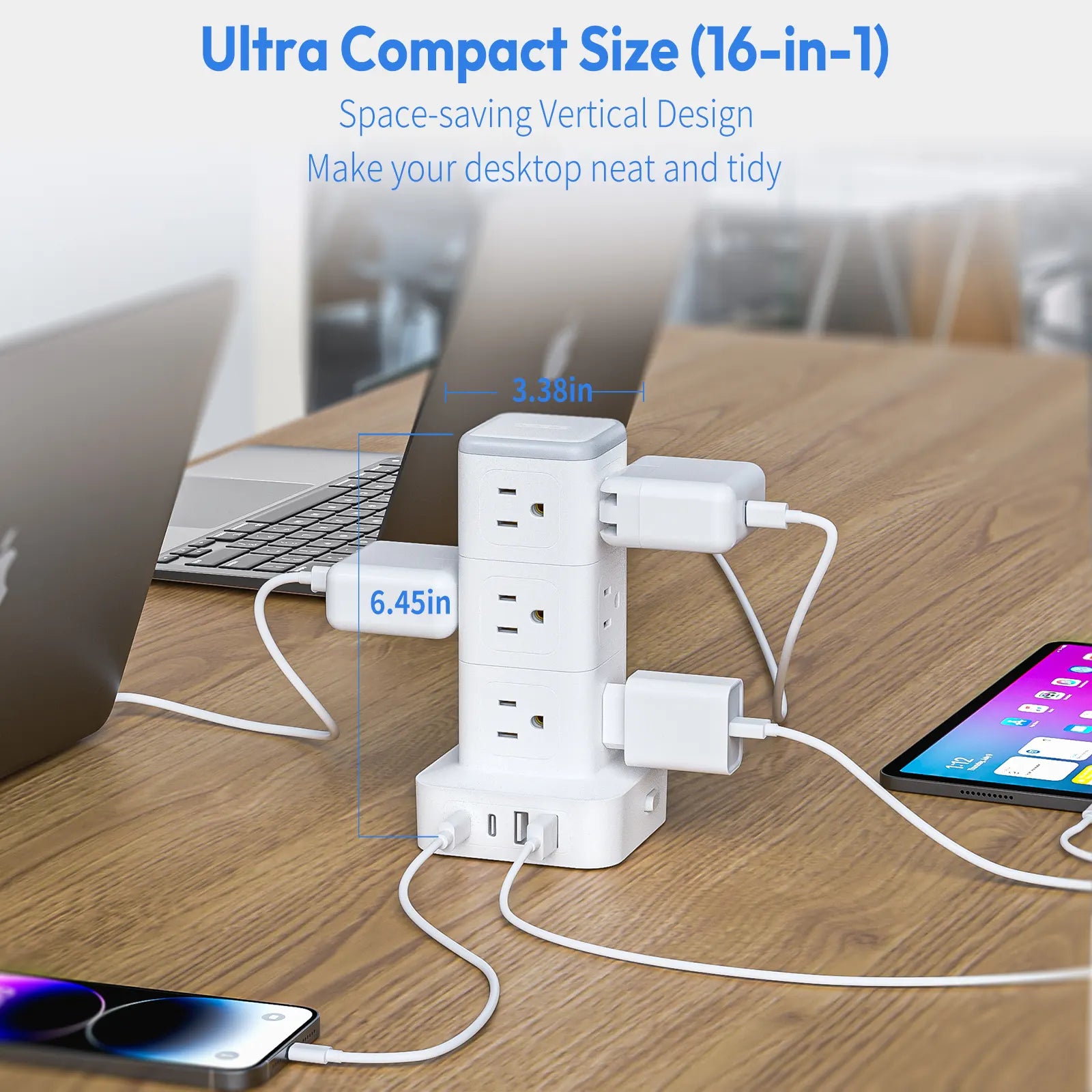 • 【 16 in 1 Power Strip Tower 】This surge protector power strip can turn 1 socket into 12 AC outlets and 2 USB C ports & 2 USB C ports, can charge 16 devices simultaneously without blocking, keeping your desktop organized; You can use it in any indoor place such as home, office and dorm room.