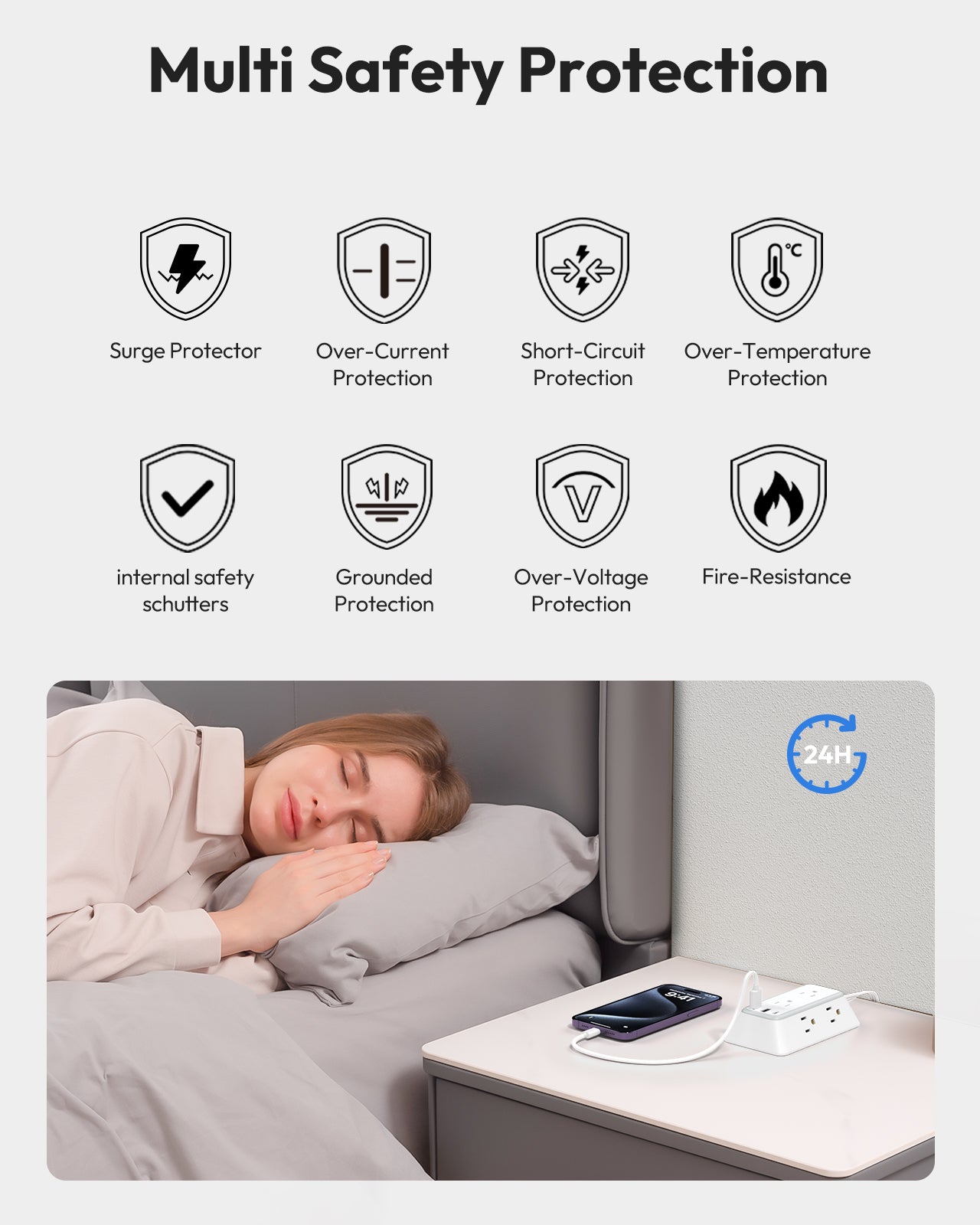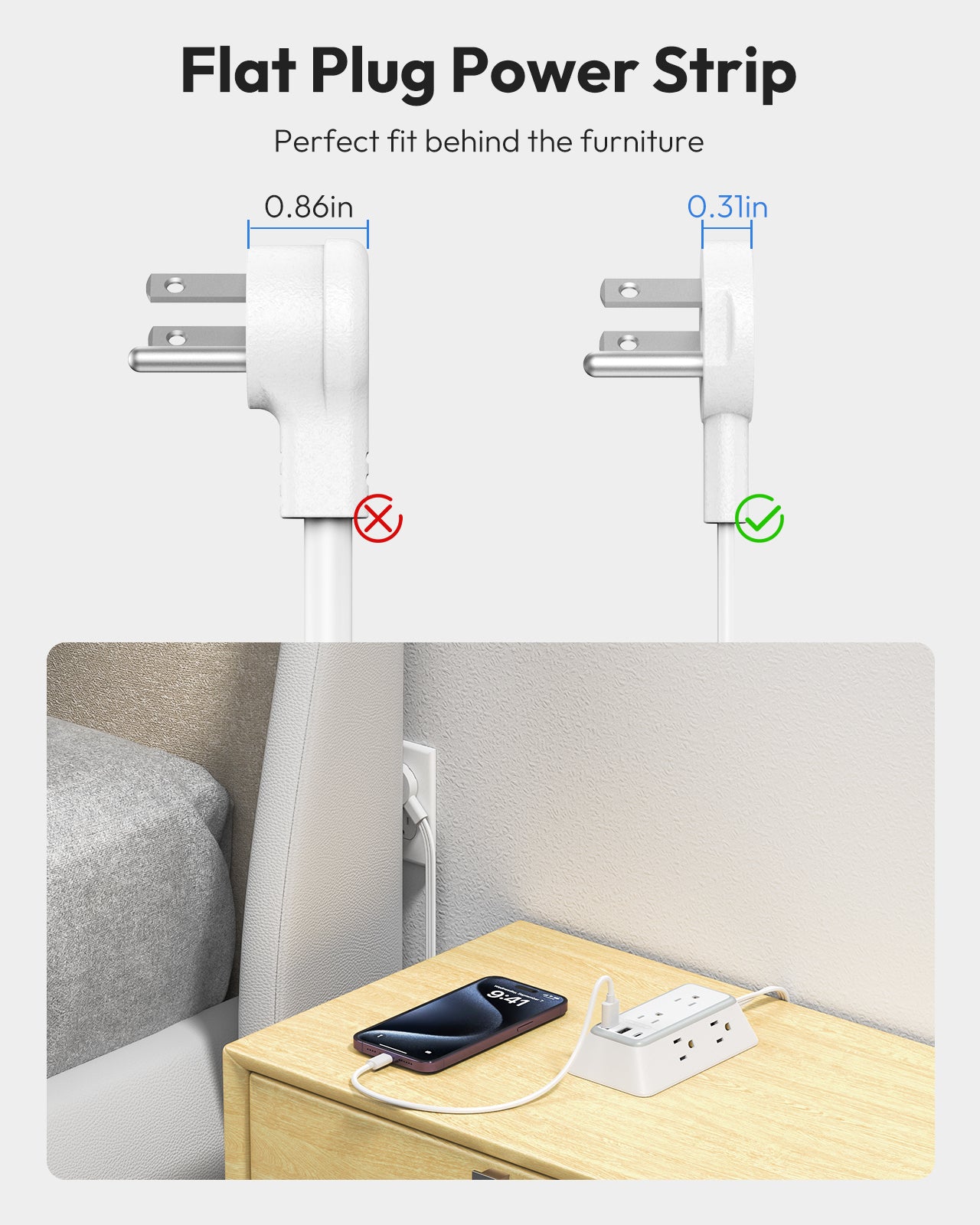 Only 0.31 inch, the flat plug fits great into the back of furniture and fits into narrow outlet spaces. This protector allows you to push your desk or nightstand closer to the wall. And a 45° design plug won't obstruct the outlet below.