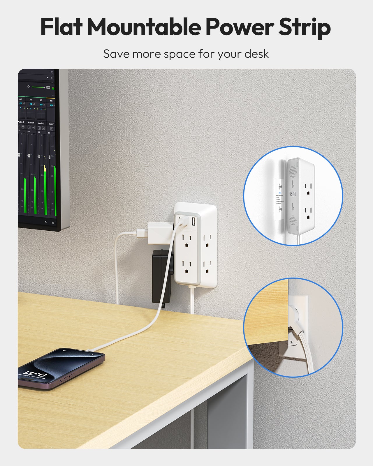 Our 3-sided power strips offer a wall mounting option. It is a great solution for creating a designated charging area without sacrificing valuable desk space. Perfect for those looking to save space or keep their charging station well organised.