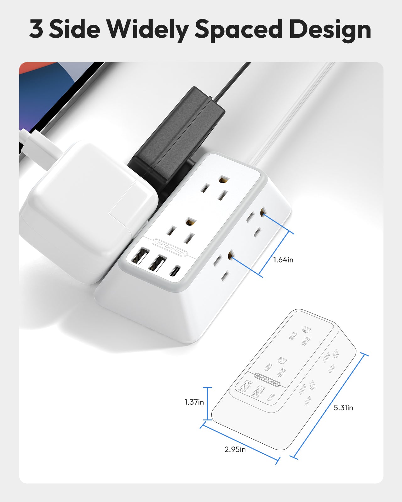 Angled 3-sided design provides more space between outlets. It accommodates larger plugs and adapters without interference, making it ideal for modern devices with bulky power bricks. Easier to access and organize cables because the outlets are on different sides. It's particularly useful in tight spaces or areas where cable management is a priority.