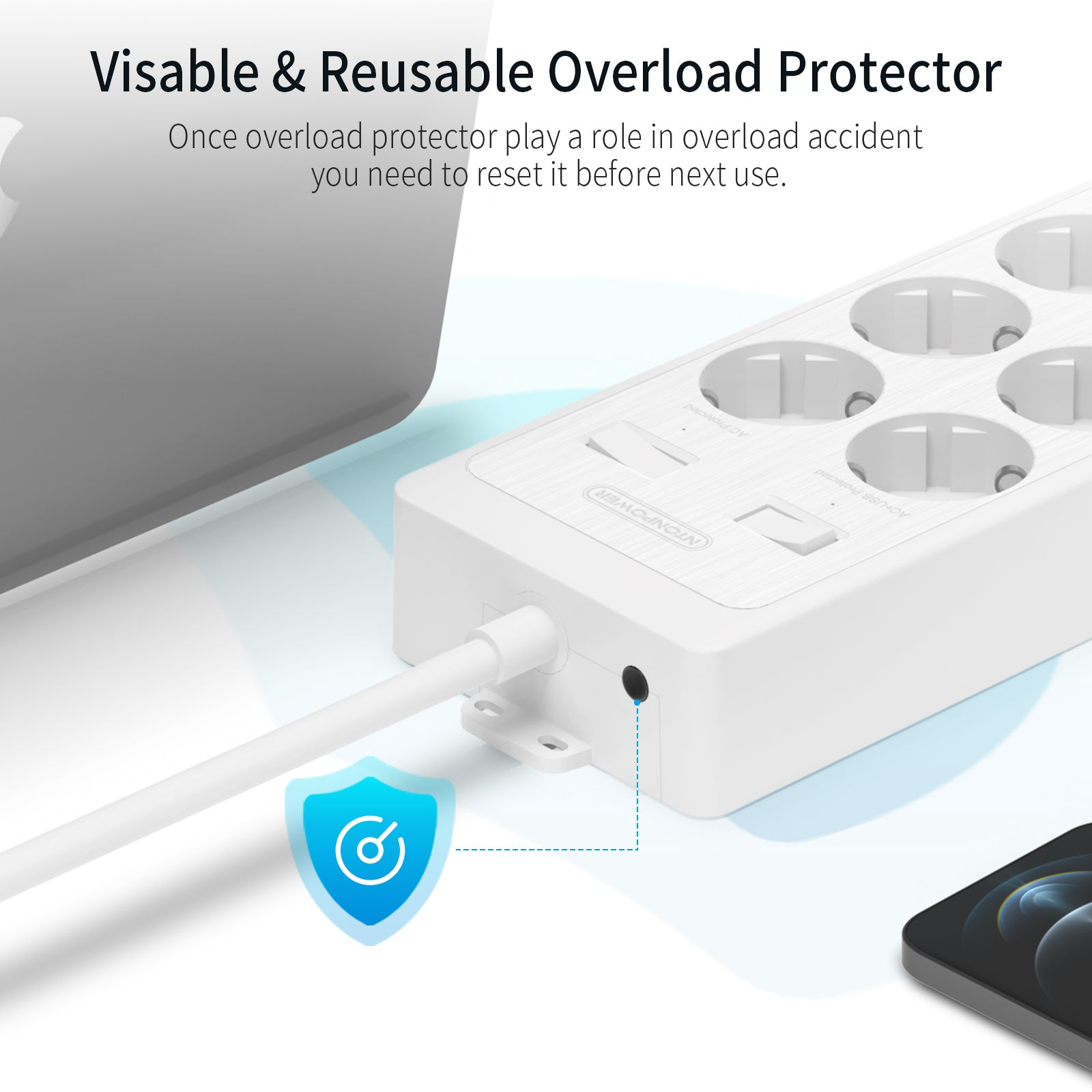 - [Multiple socket wall mounting with double overload protection] As this power strip 3 m is used to protect expensive electronics, we have set up double protection.?It is equipped with a red overload protection and the switches are also overload protection.?If there is an overload accident, the guards will soon protect your electronics.