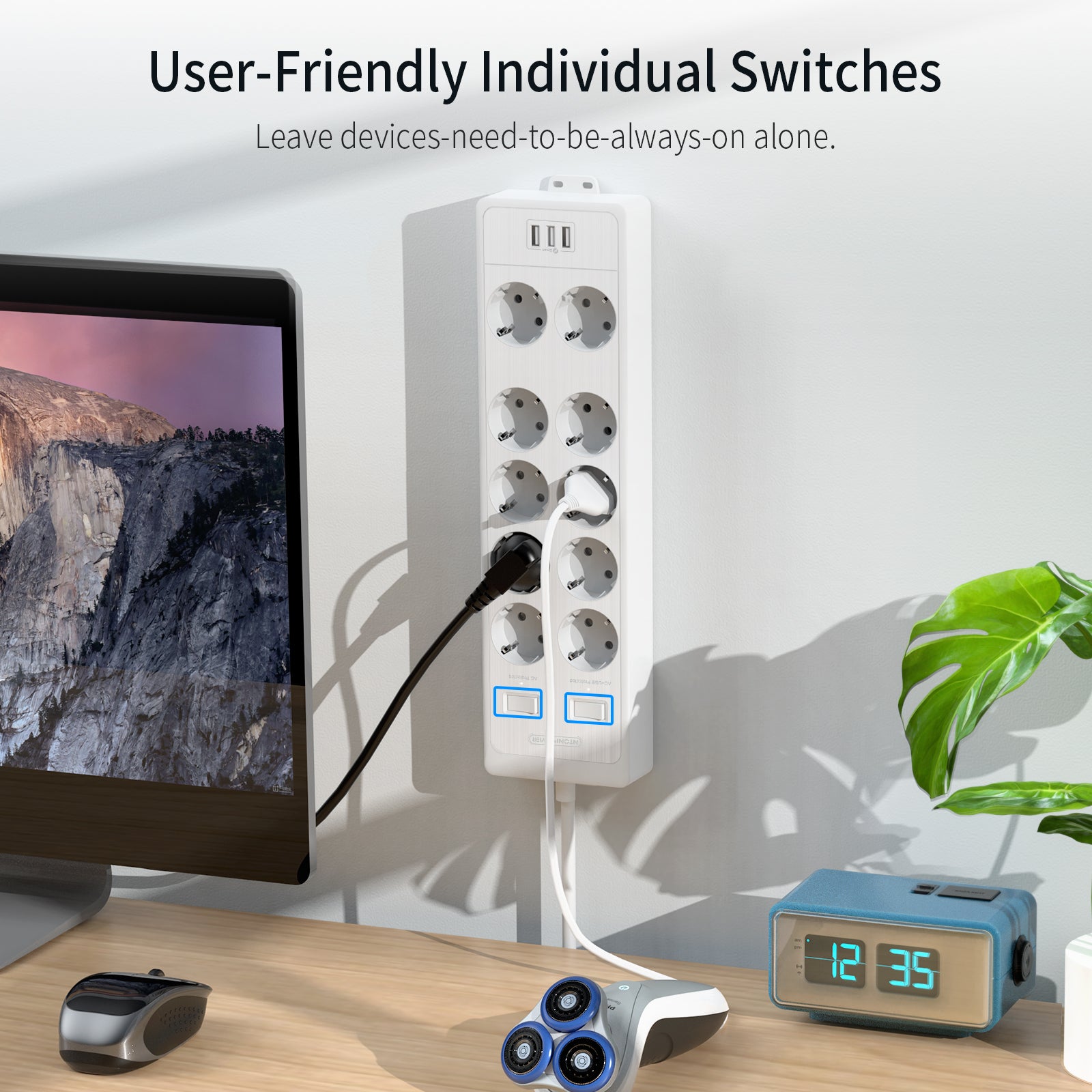 - 10-way power strip with two single switches: you can control 3 m different devices with individual switches on this power strip.?For example, one side of the sockets is for TV, floor lamp, DVD player, which are turned off at night.?And the other side of the sockets for router, phone, NAS, which need to be on all the time.