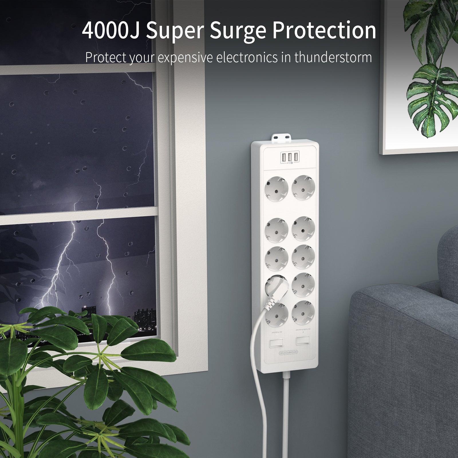 - [4000J surge protected power strip with USB] Thousands of German households lose their expensive electronics every year in thunderstorms.?A 10-way power strip with good surge protection can effectively protect your TV, sound system, PC from surges and save your money.