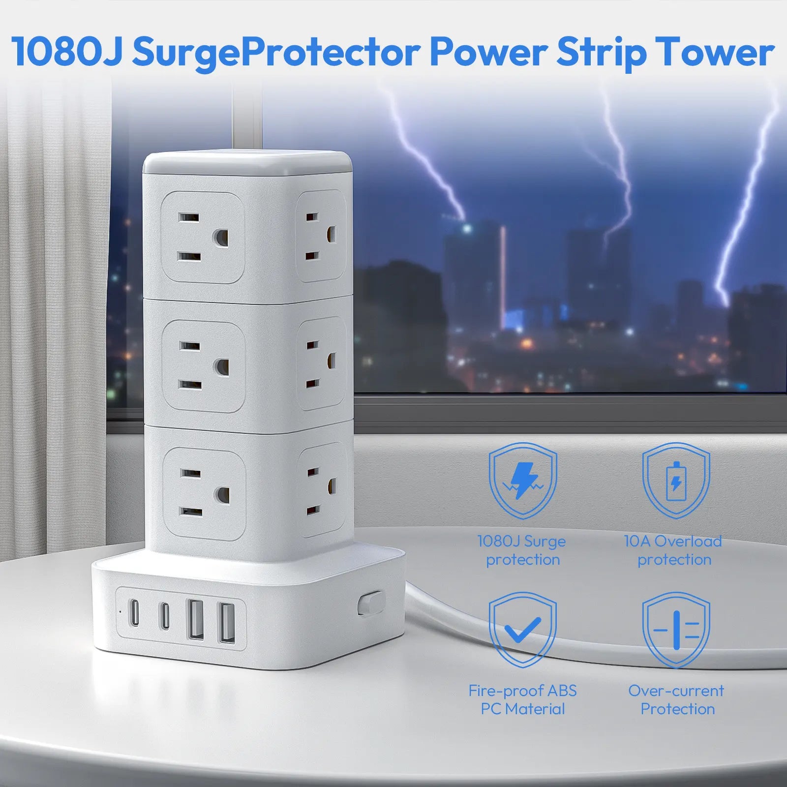 • 【 Surge Protection and Overload Protection 】The 1080 Joules surge protector tower is equipped with overload protection, short-circuit protection, and over-current protection. This tower power strip will automatically cut power to protect your expensive devices when a voltage surge is detected. The reset/off switch with the integrated circuit breaker for overload protection of all outlets.
