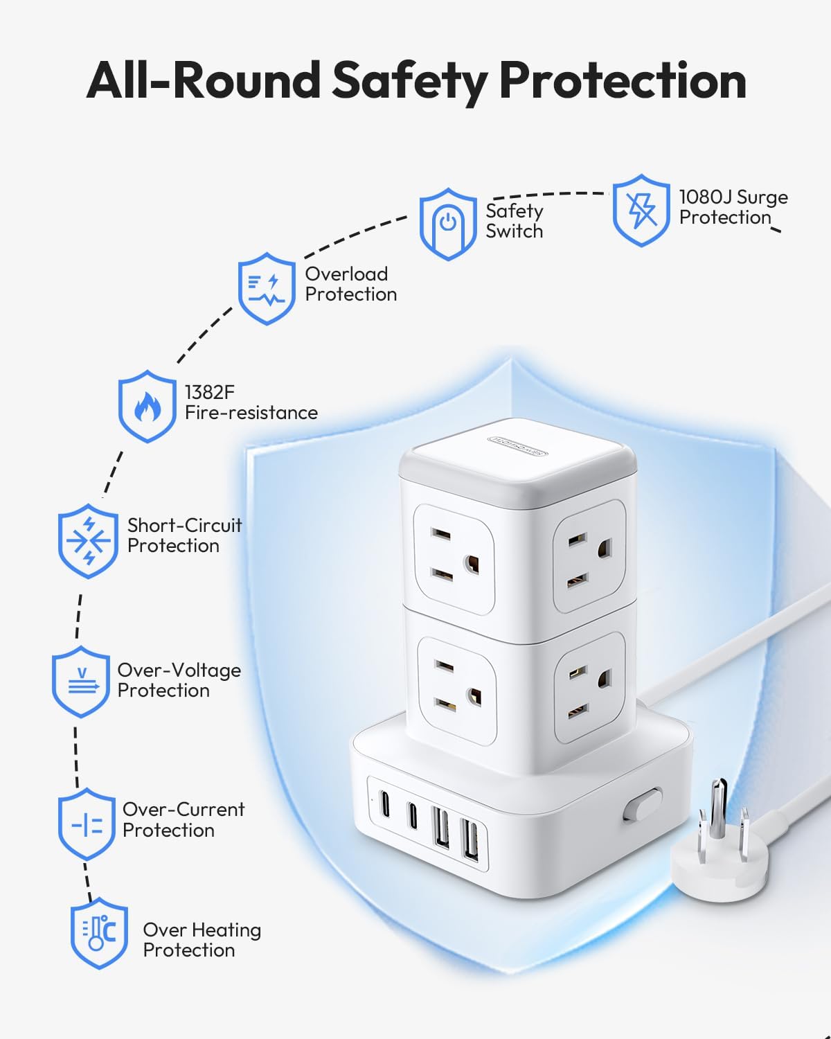 • Surge Protection & Overload Protection: The surge protector power strip tower has overload protection, short-circuit protection, over-current protection, and so on. 1080J surge protector outlet protects your electronics from power surges and lightning strikes. The 1250W 10Amp circuit breaker automatically cuts off the power when the power strip is overloaded to keep your expensive devices safe.