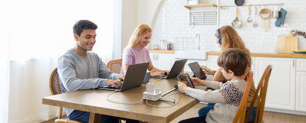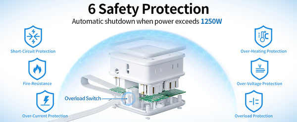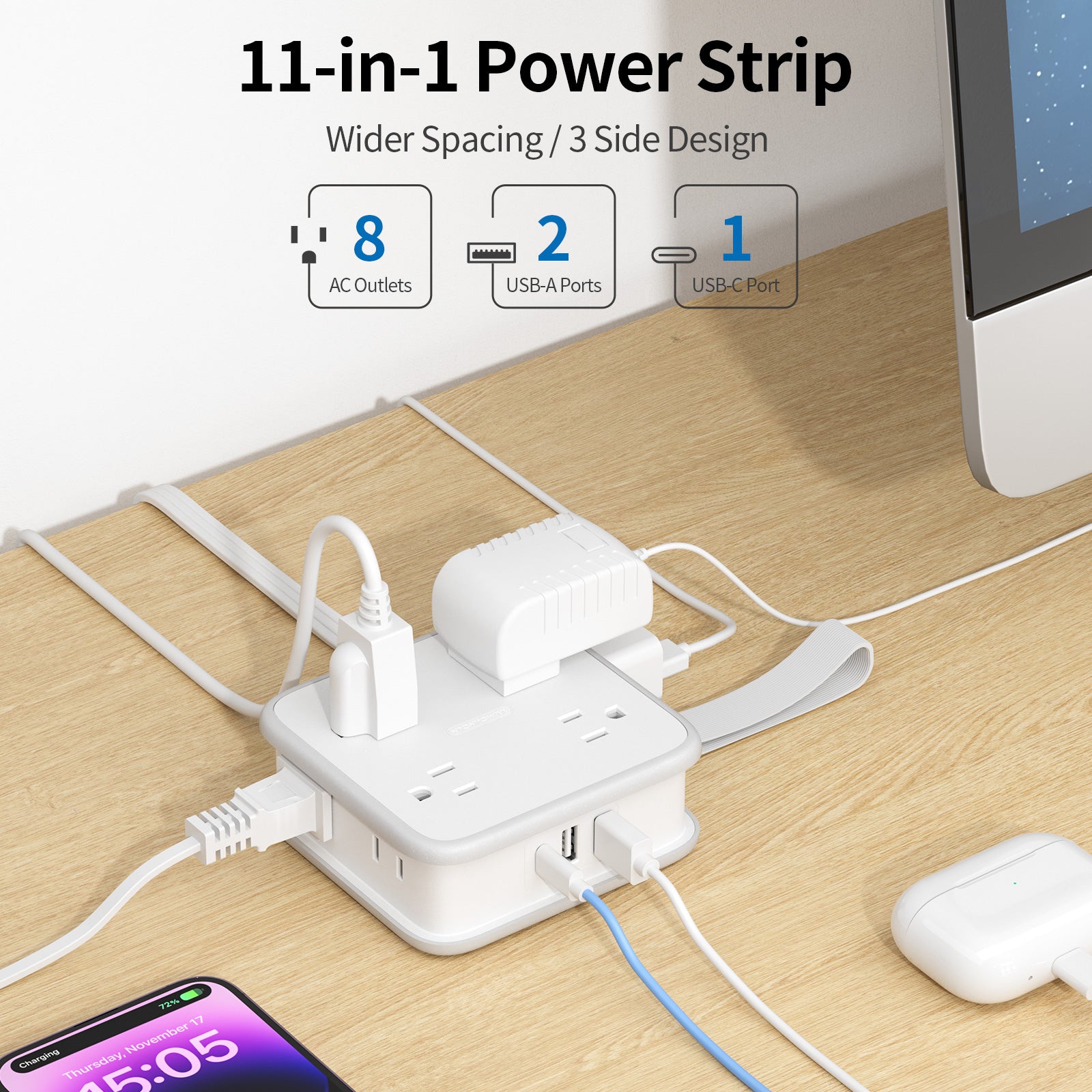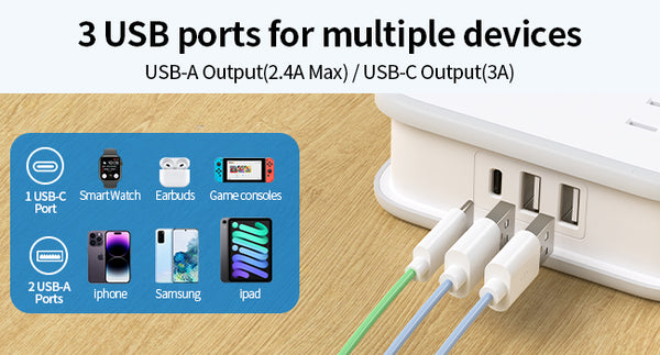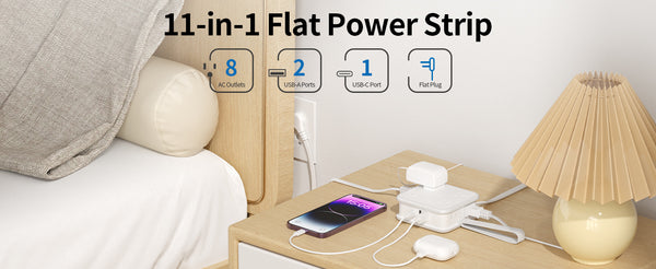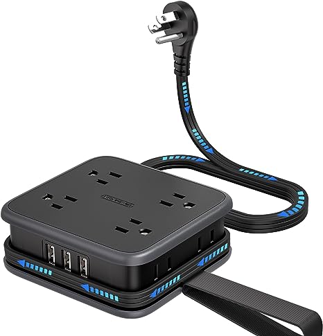 The power strip comes with a 5/10 feet long extension cord, making it the ideal solution for getting away from your devices and room sockets! The flat power cord can be cleverly hidden under carpets and through doors without the fear of tripping over it, and you can freely choose the length you need.