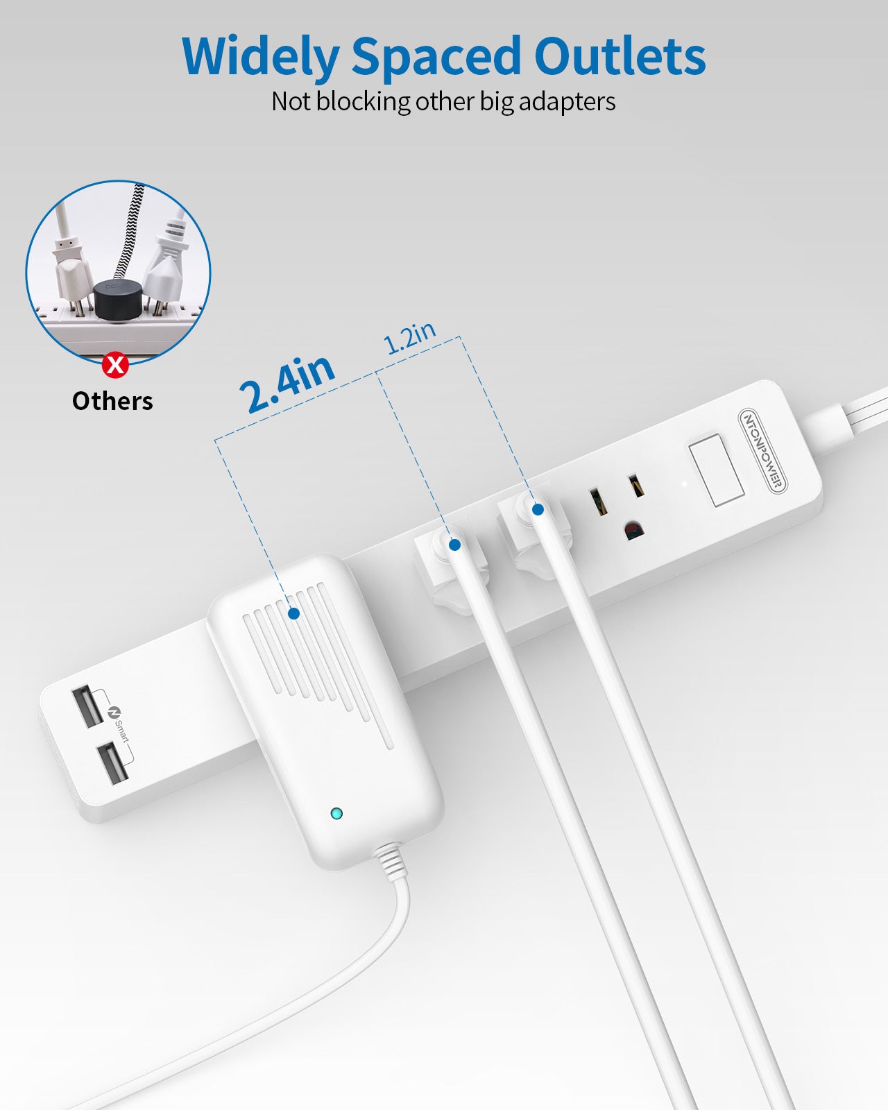 2.Are you angry about not being able to plug in many plugs in power strip at the same time ??Now Ntonpower flat plug power strip help you solve this problem . This flat power strip has many wide-pitch outlets, and you can plug in 3 to 4 large adapters or plugs at the same time.