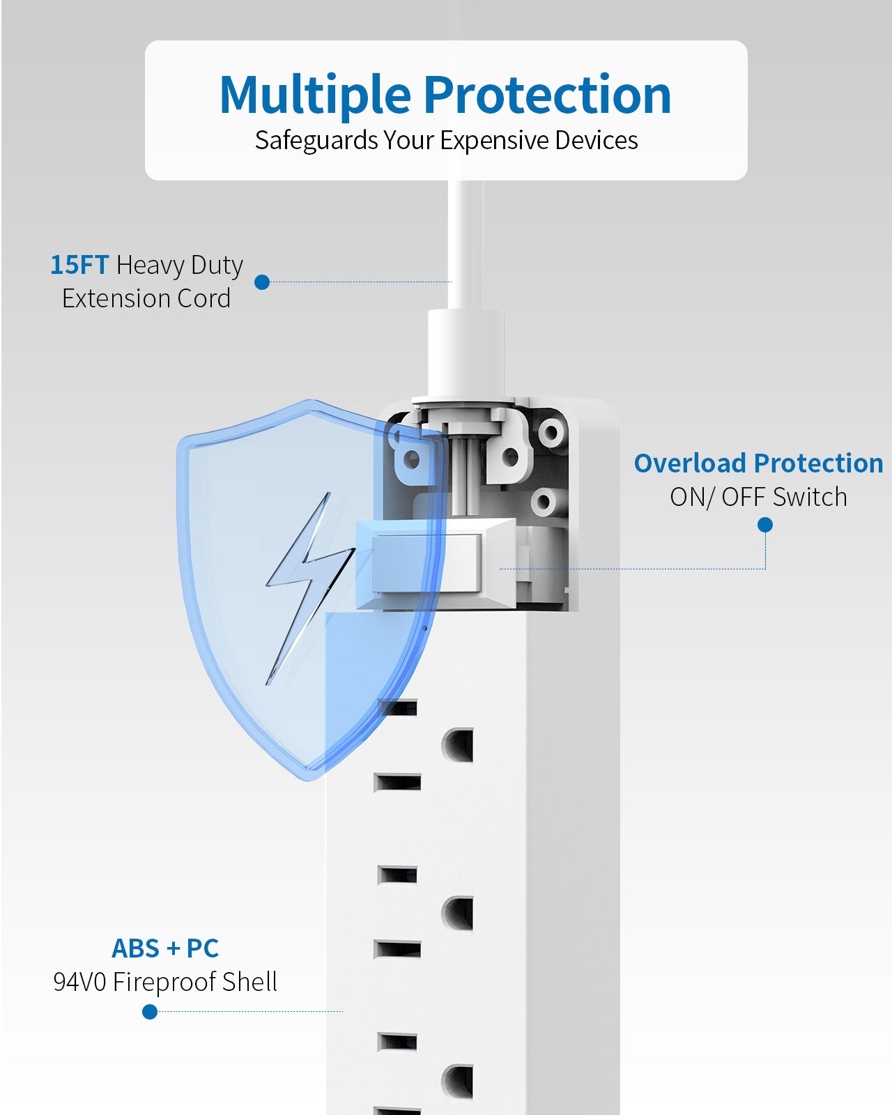 【 Long Extension Cord with Multiple Outlets 】 Overload Protector with switchs will trip off automatically to protect your devices and your home when the power overload (1250W/125V~ 10A). Environmental protection and fire-resistance PC shell with flame retardant at 1382�H makes it more durable and longer lifetime. High-end solid capacitors ensure complete protection against electrical short circuits, overheating/ charging/ current/ voltage.You can use it safely without worrying about overheating.
