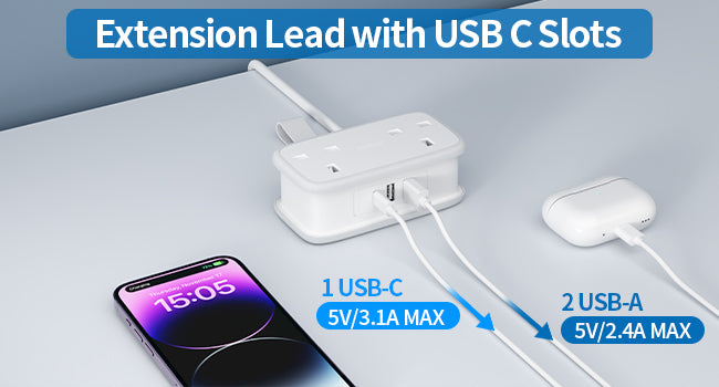 • 【Extension Lead with Usb C Slots】Supports Smart & Fast Charging - Offers Smart Charging USB-A output 5V/2.4A, USB-C output 5V/3A,Type-C charging port 3A MAX, and come with smart charging technology detects your connected USB devices and adjusts current output for the optimal charge which can reach faster charging efficiency. NOTE:The Type-C port doesn't support Macbook, Macbook Air, Macbook Pro or any other laptops which needs 14~22V charging voltage.