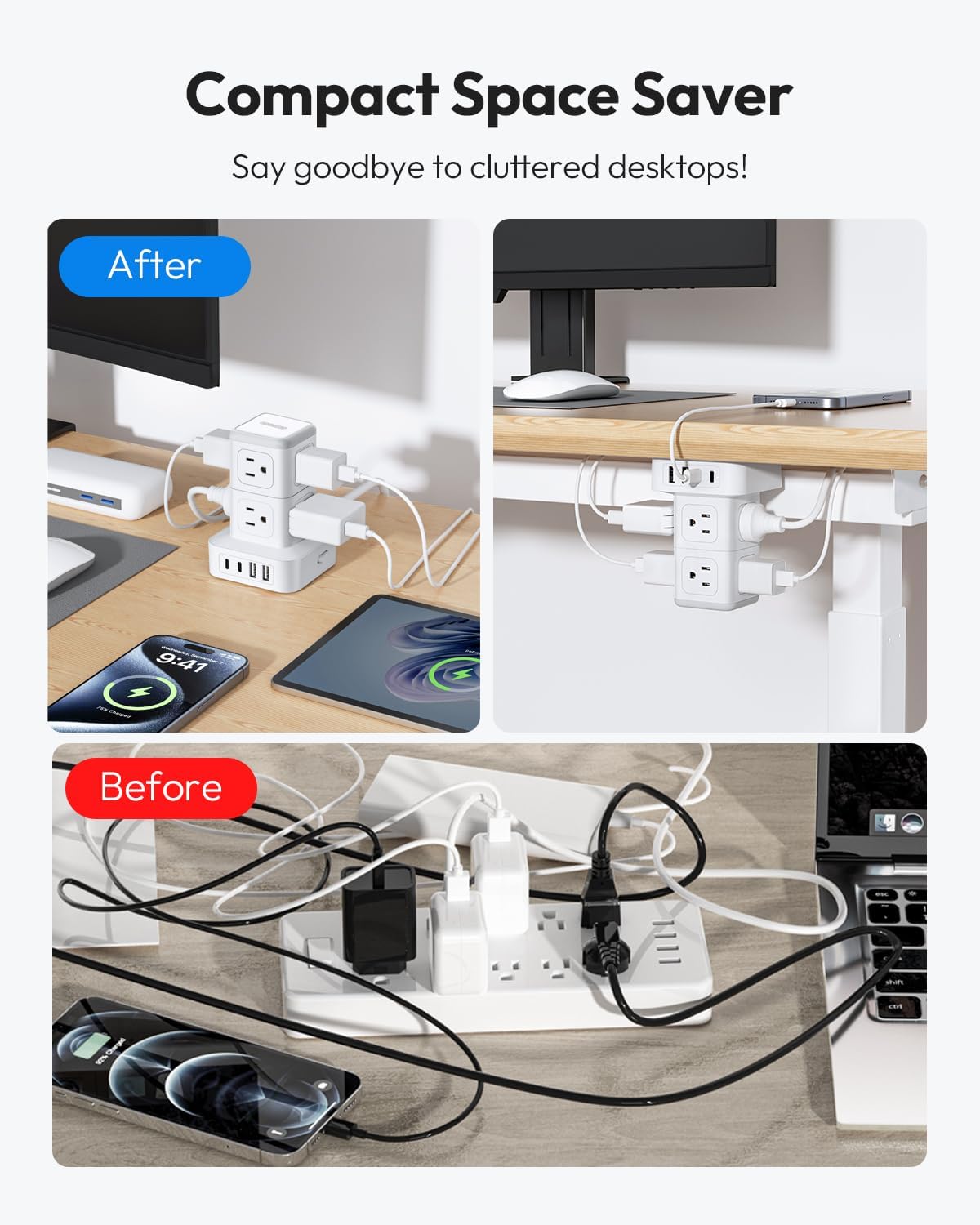- Space Saver Installations: Say goodbye to cluttered desktops! Not only the compact vertical charging station saves precious surface space, making your desktop more organized and tidy than traditional extension cords, but also the keyholes on the bottom of the power tower ensure secure installation under desks or tables.