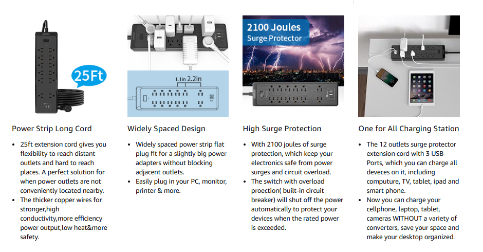 2.The power surge protector with?2100 Joules Surge Protection,?which?safeguards your electronics from power surges, which are brief spikes in voltage.