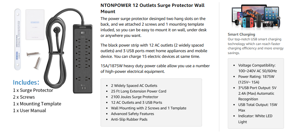 • Ntonpower Surge Protector Power Strip 12 Outlets 2 USB-A 1-USB C(SKU: LS-12A3U-US-BK-4.6M, ASIN: B08CKBHCLD, GTIN:6954301173823)