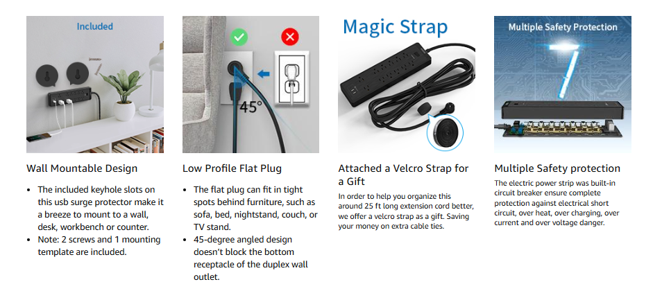 1.25ft Extension Cord, get easy access to place that's hard to reach, extend the portable surge protector to table or other place easily where need power outlets or usb charging ports simultaneously.